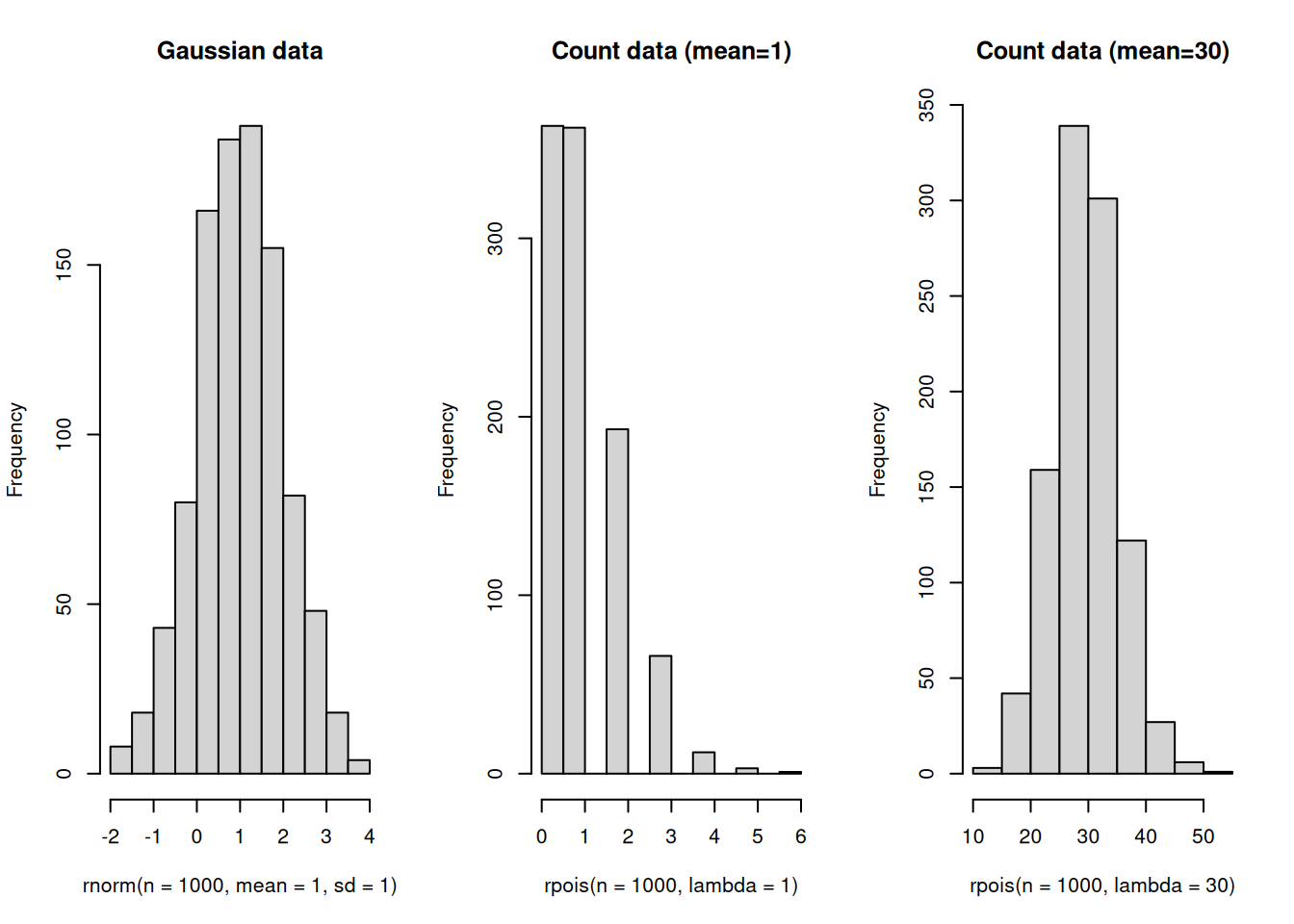 It’s worth noting that count data are most difficult to work with when the mean is close to zero, because of the constraint that counts have to be positive. If the mean is much higher than zero, this becomes less of an issue. For example, the third plot above shows count data with a mean of 30. You can see that the data are pretty symmetrical, and because the data can take on more values (integers between about 15 and 50) they are somewhat more continuous than when the mean was one. In these cases it may be acceptable to treat these data as if they were normally distributed, with caution.