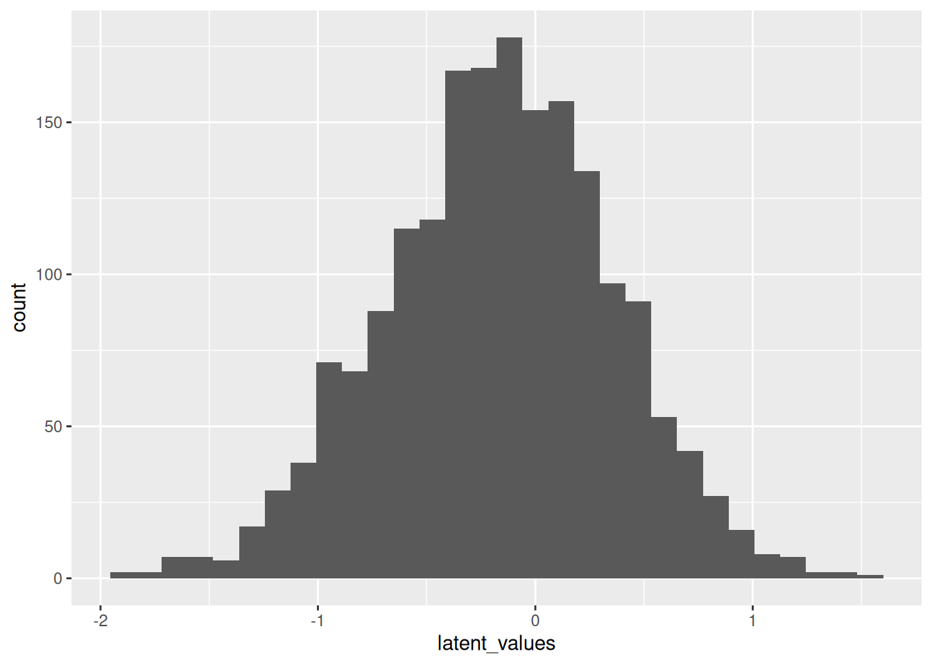 Usually tutorials start with some binary data and work backwards to the latent scale (see this paper, for example), because this is how an analysis typically works. Here, I will do the opposite: we’ll start from the latent scale and work forwards to the observed scale. The goal is to illustrate how binary data arises from underlying biological processes.