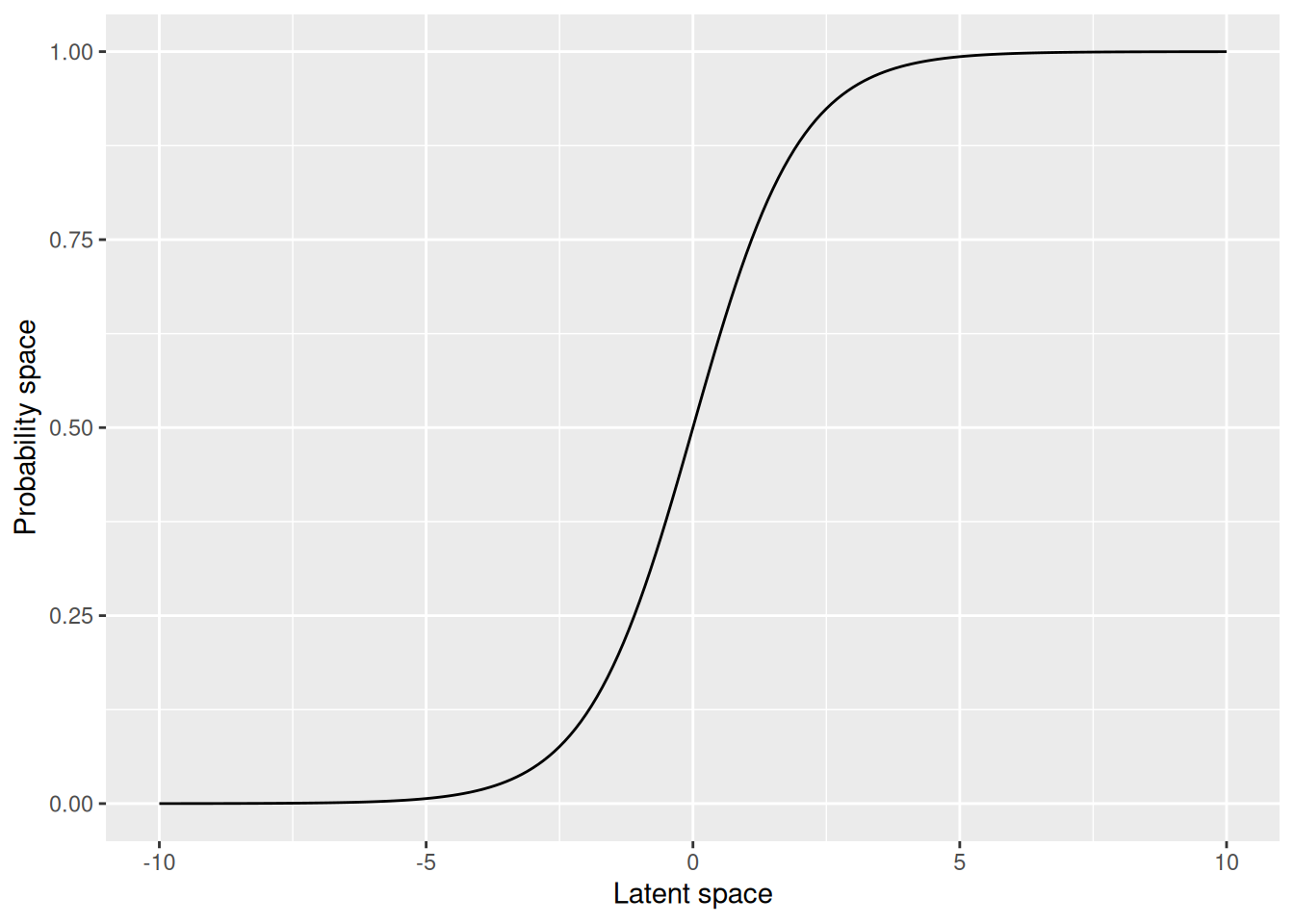 The expected and latent scales are linked by a function called the link function. There are several link functions you might use to move from the expected to the latent scales, but a common choice is the logit function: \[ \log \frac{p}{1-p} \] where \(p\) is the expected (probability) value.