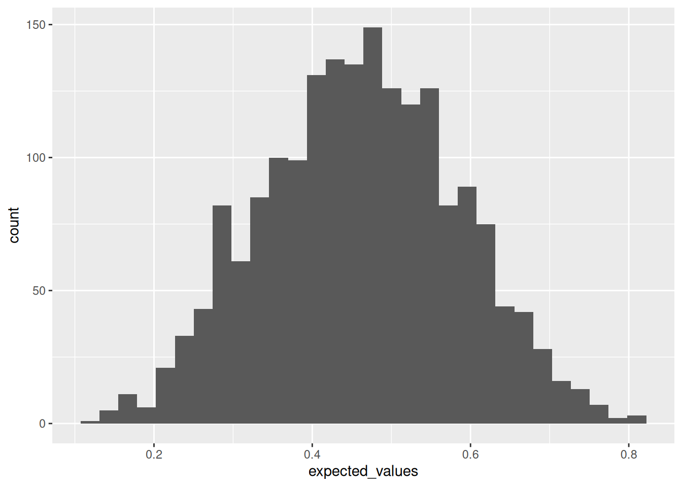 However, you would expect to return the expected values if you average over enough binary outcomes. As a sanity check that this has worked, here is the mean binary phenotype in bins of 0.05 units of the expected values. You can see that as the expected value increases, so do the binary outcomes, at least on average, which is reassuring.