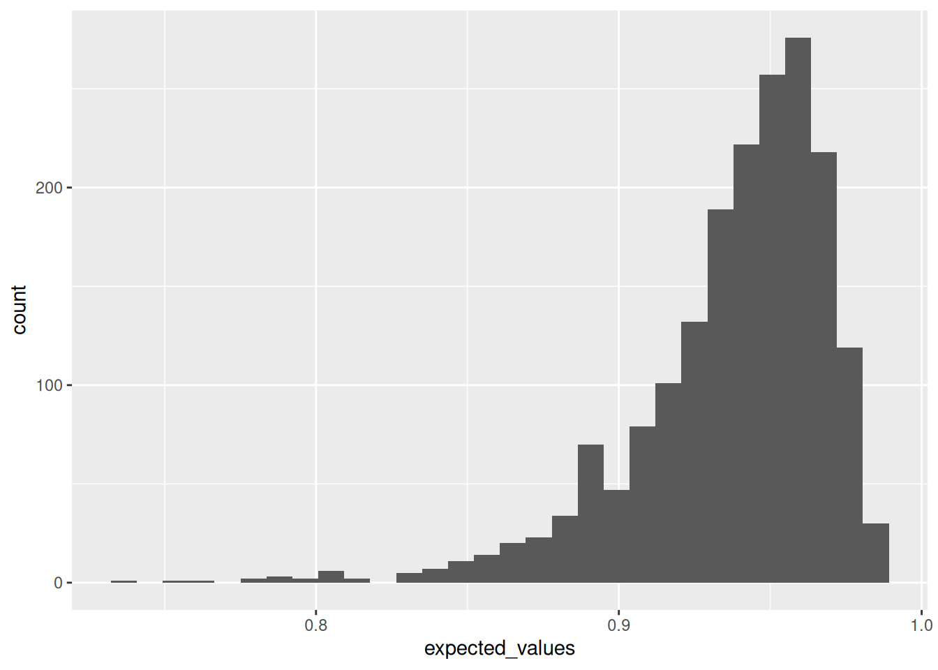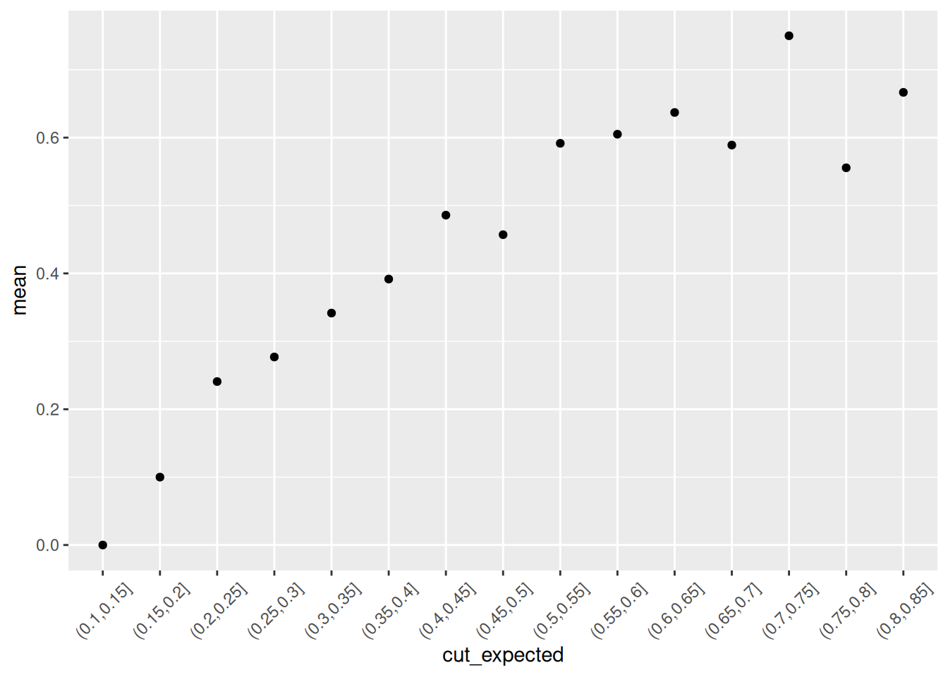 Here is a boxplot of expected values against binary outcomes. The spread is huge. You can easily get zeroes and ones from the whole spectrum of expected values. This is just how binomial sampling works - it’s a messy process when you look at individual outcomes.